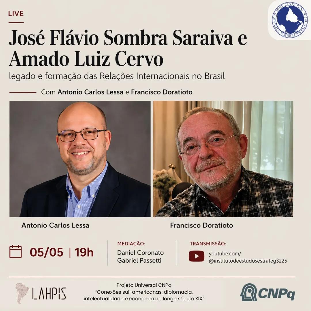 O Laboratório de História da Política Internacional Sul-americana (LAHPIS) da Universidade Federal Fluminense (UFF), com o apoio do curso de Relações Internacionais da Universidade Federal do Rio Grande (FURG) e do professor Fernando Comiran (FURG), promove uma live com Antonio Carlos Lessa e Francisco Doratioto, dois dos principais nomes do campo, para discutir o legado intelectual de José Flávio Sombra Saraiva e Amado Luiz Cervo na formação das Relações Internacionais no Brasil.